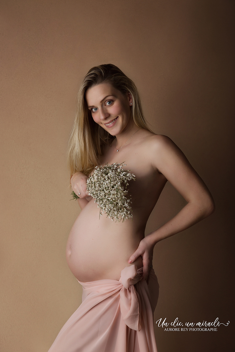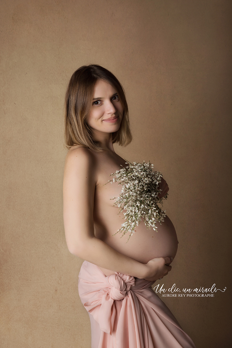 Pour le côté artistique, j’ai voulu innover en proposant une nouvelle mise en scène. Un portrait fleuri, demi-dénudé, mettant en valeur les belles courbes de la femme enceinte. Sindy était sous le charme du résultat. Et en voyant cela, Sarah voulait absolument le même portrait, car ça change de ce qu’on voit d’habitude sur les photos des futures mamans et c’est magnifique.