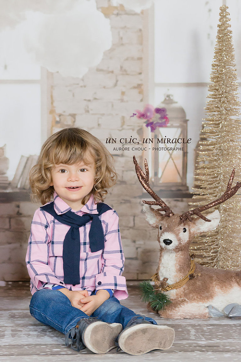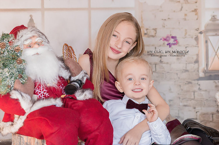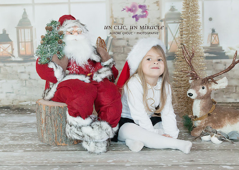 La prestation dure une demie heure, avec un décor de Noël et un fond du même esprit. Quand il fait beau, je travaille en lumière naturelle (lumière du soleil). S’il fait mauvais temps, comme cette année, j’utilise des softs box, ce sont des boîtes à lumière artificielle, qui n’abîment pas les yeux de vos enfants.