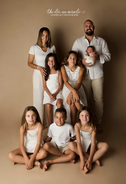 Séance photo naissance avec une famille nombreuse
