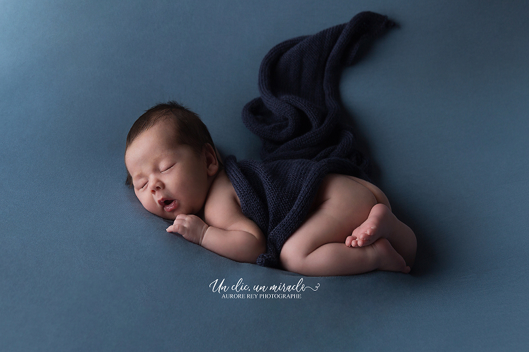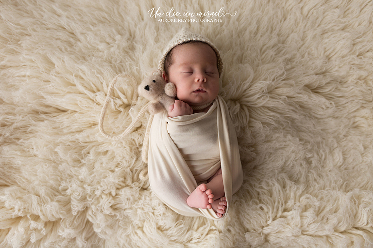 On a démarré le shooting bébé par un emmaillotage, pour l’apaiser et le rassurer.