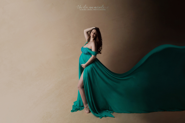 La future maman, a su immédiatement quelles robes elle souhaité porter. Pour les prises de vue, je les ai guidés tout en demandant si je pouvais leur placer correctement leur visage, mains, chevelure, pour avoir LE cliché parfait. Je demande systématiquement par respect auprès de mes clientes.