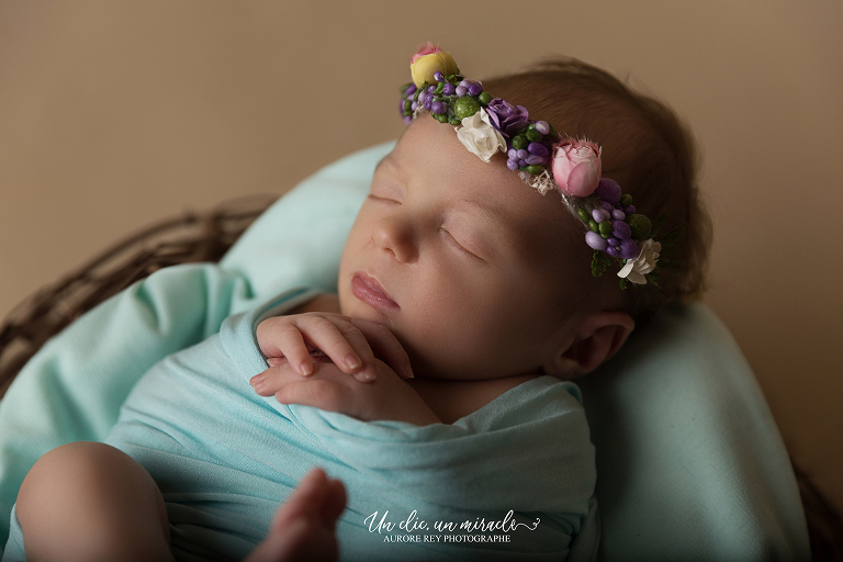 On passe au second décor, qui est une mise en scène dans un nid. Avec Ambre, bien emmailloté, serti d’une belle couronne de fleurs.